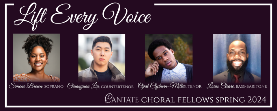 Bethesda, MD, December 28, 2023 – Cantate proudly announces its Spring 2024 Lift Every Voice Cohort: Simone Brown, soprano; Chuanyuan Liu, countertenor; Opal Clyburn-Miller, tenor; and Louis Cleare, bass-baritone. These extraordinary young singers will join Cantate Concert Choir to provide skilled support to each of the sections while receiving professional-level training and first-hand experience in the performance of varied choral repertoire. In the program’s pilot semester (Spring 2024) each of these fellows will receive additional support and opportunities from Cantate’s community of seasoned arts professionals: resume consulting, vocal coaching, and an oratorio masterclass open to the public. Fellows will emerge from their residency with Cantate better prepared to advance their musical careers in the choral field.