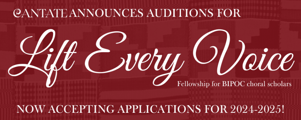 Lift Every Voice (LEV) is a year-long paid fellowship for aspiring BIPOC classical singers, which provides vital training, networking, and performance opportunities to advance their careers in choral music and solo oratorio performance. Four pre-professional vocalists, selected by audition, will join Cantate Concert Choir to provide skilled support to each of the sections while also receiving additional opportunities for advancement.
