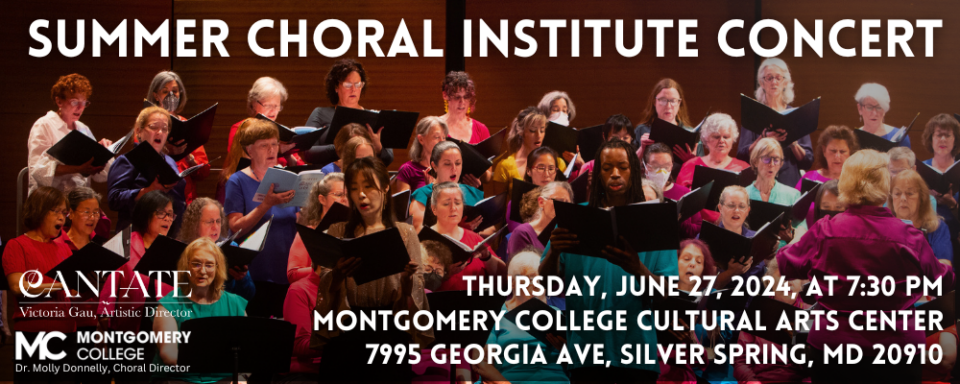 Cantate partners once again with Montgomery College’s Chamber Singers to reprise the Summer Choral Institute under the co-direction of Cantate Artistic Director Victoria Gau and Montgomery College Professor of Music Molly Donnelly. Two weeks of intensive workshop-rehearsals culminate in a free public concert offered Thursday, June 27, at 7:30 pm. Join us for a varied and inspiring program: